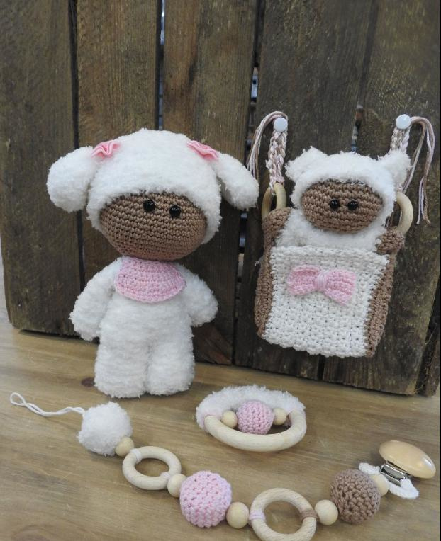 OverzichtMet dit leuke complete pakket maakt u maar liefst 5 items: een knuffelschaapje, een kroelpopje, een boxtasje, een bijt/speelring en een spenenketting.