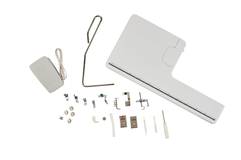 | Inhoud van de doos | Zachte beschermhoes Kleine schroevendraaier Medium schroevendraaier Schoonmaakborsteltje Kniehevel Naalden Schroef voor geleiderplaat Stof scheider Extra pin voor Pin Feed Pin Feed verwisselaar Algemene naaivoet Metalen spoeltjes (5) Garenklos houder Rolzoom voet Ritsvoet Blinde ritsvoet Quiltvoet 1/4 inch Naaivoet om te quilten uit de vrije hand Flexibele Pin-Feed voet (UNIEK) - op de machine Naadgeleider Voetpedaal Extra grote verlengtafel Garenklos netje Kloshouder (op de machine) |